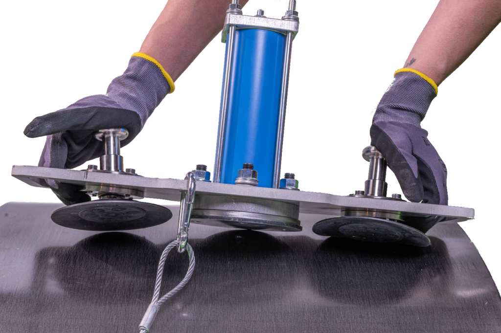 Die revolutionäre Neuentwicklung des Spezialisten für Magnethaftkraft basiert auf einer Aluminiumplatte, die geringes Eigengewicht mit Robustheit verbindet. An dieser Platte sind über Kugelgelenke zwei Saugnäpfe aus flexiblem Kunststoff mit eingearbeiteten Neodym-Magneten verschraubt. Die Magnet-Saugnapf-Kombination passt sich flexibel der Form des Behälters an und gleicht Neigungen sowie Wölbungen aus. Damit ist der „Klopfer to go“ auch bestens für raue und verschmutzte Oberflächen geeignet.