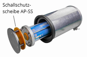 Die Schallschutzhaube wird über den pneumatischen Klopfer und – sofern vorhanden – das Magnetsteuerventil gestülpt und an den Klopfer angeschraubt. Sie ist mit einer Gummidurchführung für den Druckluftschlauch und einem Schalldämpfer für die Spülluft ausgestattet. Zur Silowand hin vermindert ein Gummi-Kantenschutzprofil den Schall. Es passt sich den Konturen des Silos an.