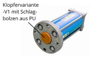 Wird der Schlag durch gummielastische Werkstoffe gedämpft, kann die Geräuschentwicklung reduziert werden. Allerdings wird damit auch die Wirkung des Klopfers verringert. Der pneumatische Klopfer von singold verfügt über eine sehr hohe Schlagkraft. Nicht immer ist die volle Schlagkraft erforderlich, um den gewünschten Effekt zu erzielen. In diesem Fall kann auch ein pneumatischer Klopfer der Variante V1 eingesetzt werden. Bei diesen Modellen wird der Schlagbolzen aus Vulkollan (PU) gefertigt. In Verbindung mit einer Vulkollan-Schallschutzscheibe, die zwischen Anschweißplatte und Klopfer geklemmt wird, lässt sich die Geräuschentwicklung deutlich verringern.
