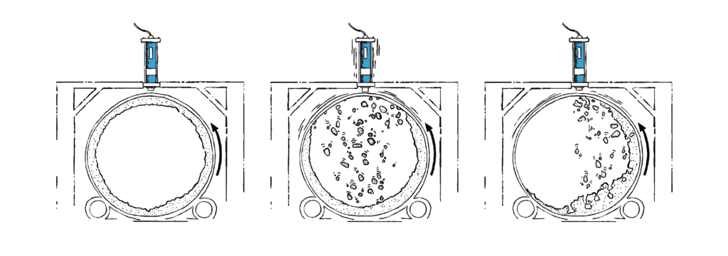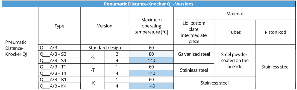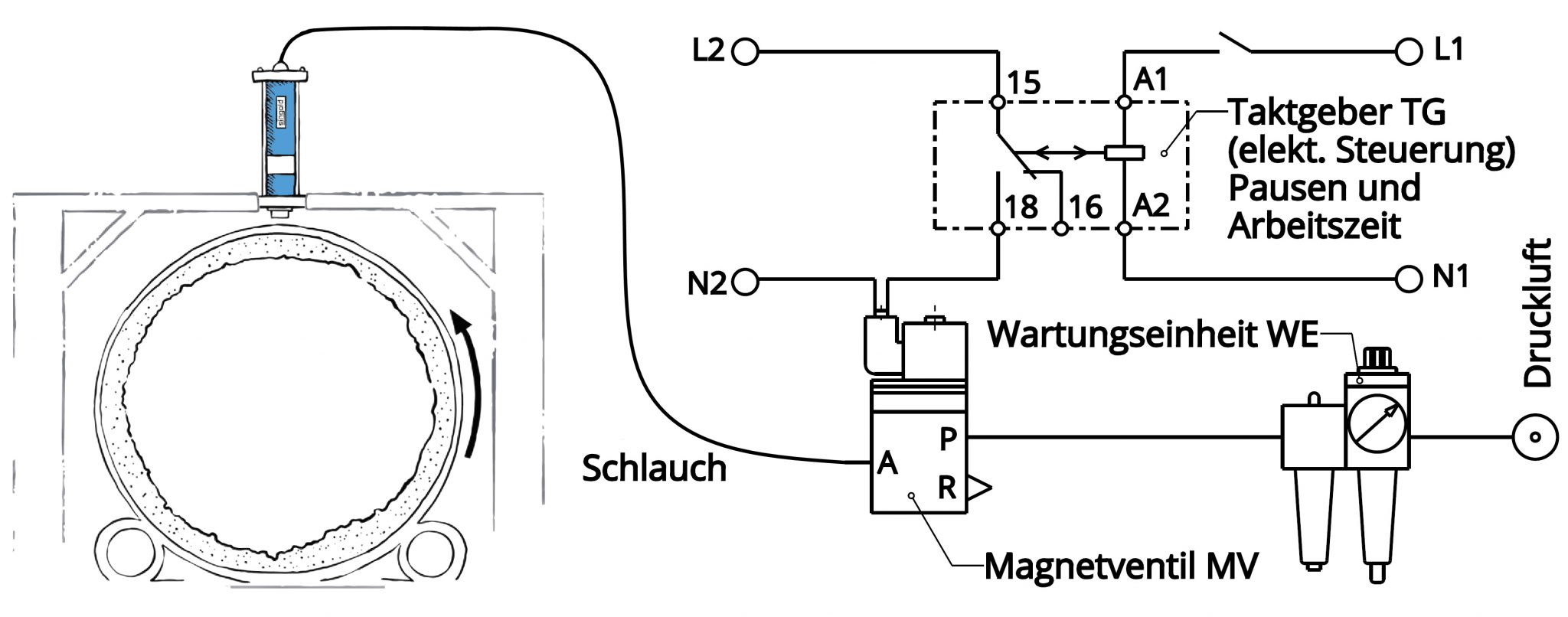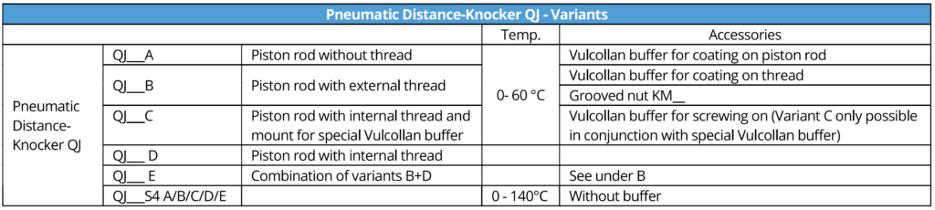 The Pneumatic Distance Knocker QJ is particularly suitable for knocking on changing containers or slowly rotating drums, as well as for hot walls. The piston rod is designed to bridge a certain distance to a container or a rotating drum.