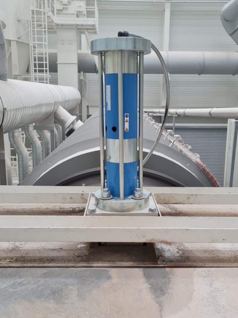 Distance Knocker QJ100, mounted on a solid frame on a rotary kiln in France. Unrivalled in terms of impact energy, efficiency and cost-effectiveness – clearly superior to conventional impact cylinders.Largest and most powerful distance knocker in the world QJ125, mountes on the cooling pipe of an Elino rotary kiln. The Distance Knocker is absolutely essential to the production process.
